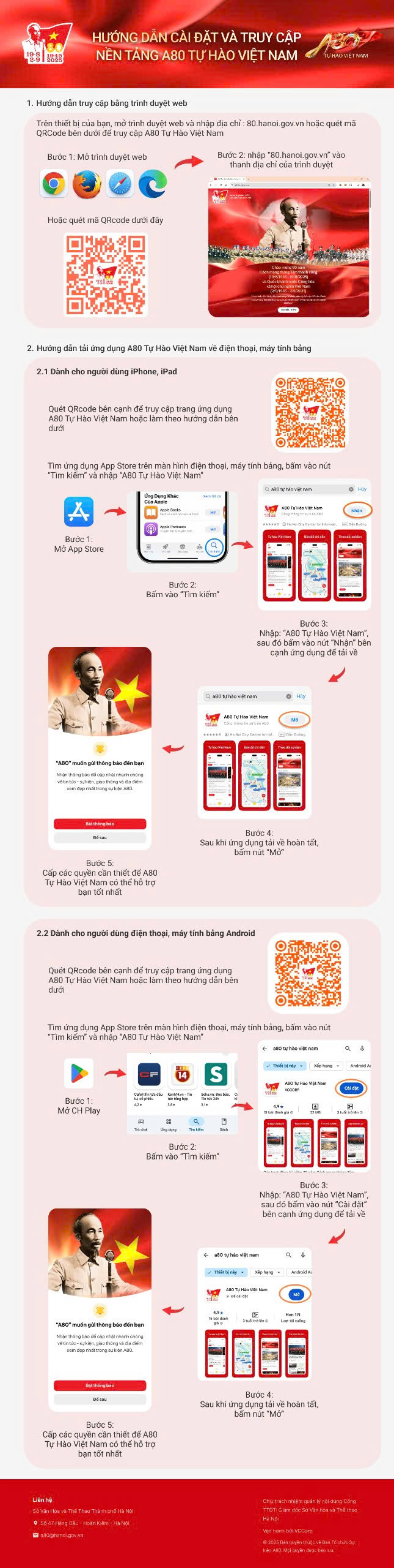 Không chỉ xây dựng riêng một website tại địa chỉ https://a80.hanoi.gov.vn/ để người dân có thể nhanh chóng lắm bắt thông tin và sự kiện trong duyệt binh A80, người dân còn có thể cài đặt ứng dụng A80 ngay trên điện thoại của mình thông qua hướng dẫn chi tiết dưới đây.
