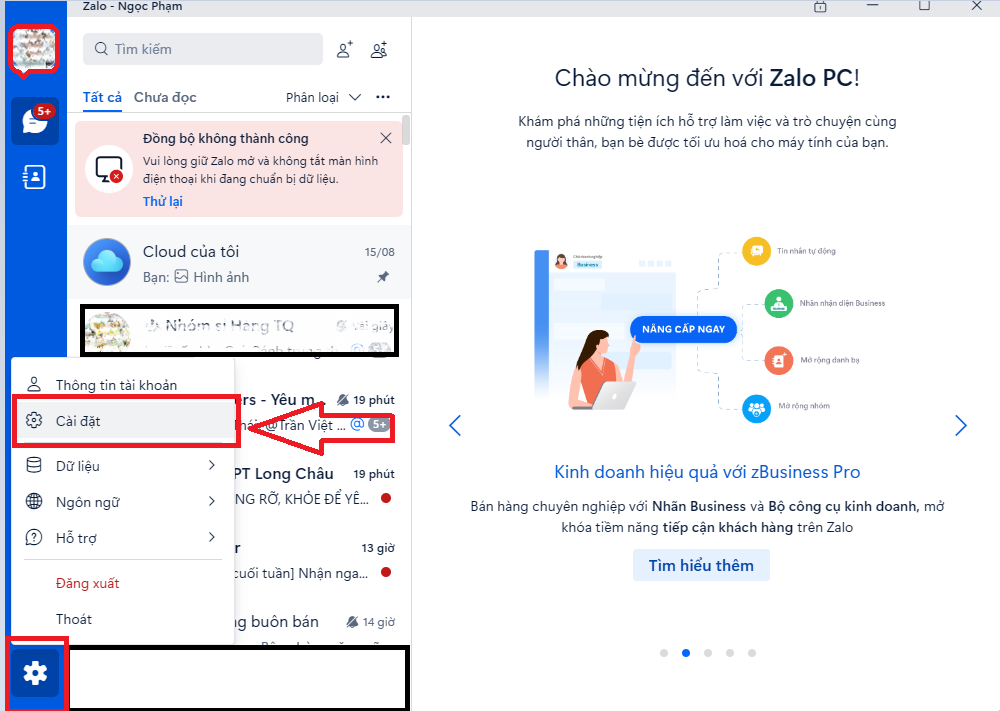Bước 2: Chọn vào hình bánh răng ( góc dưới, bên trái màn hình của Zalo PC ) rồi chọn Cài Đặt