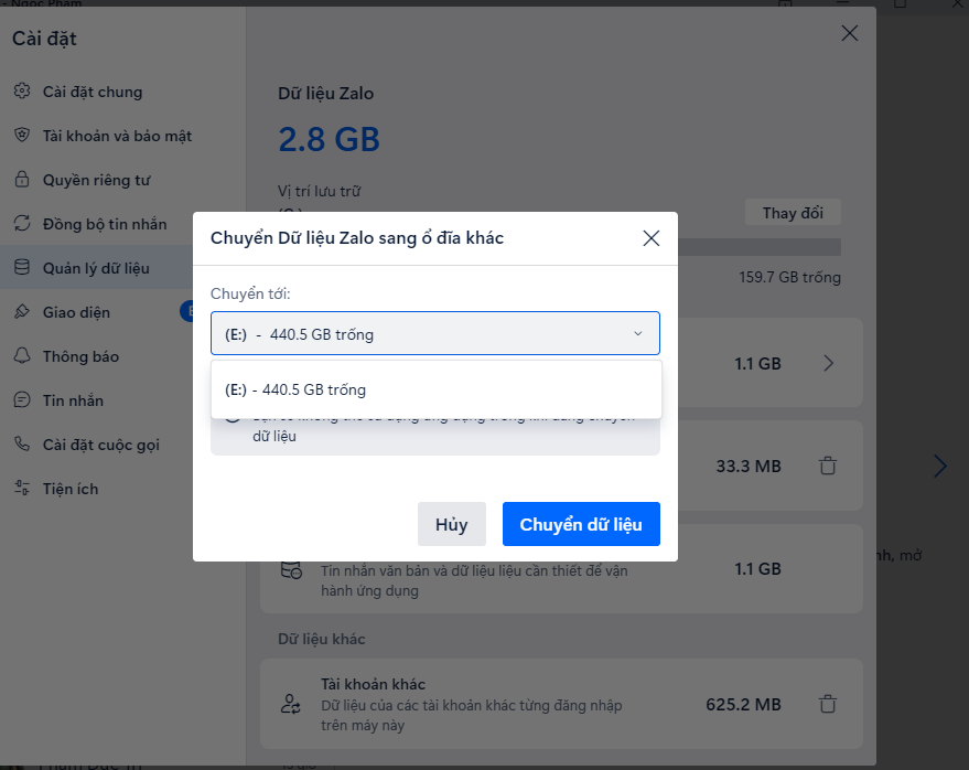 Bước 5: Chờ một chút, Zalo sẽ chuyển dữ liệu sang ổ mới cho bạn
